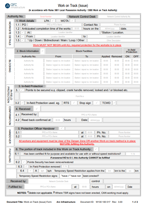 A must-have for every Protection Officer, the Work on Track Authority (WOTA) Pad is the essential paperwork for managing safe rail access within the Arc Infrastructure controlled network. These industry-standard pads provide a clear, consistent format for documenting and authorizing work on track—ensuring compliance and communication at every stage of the job.